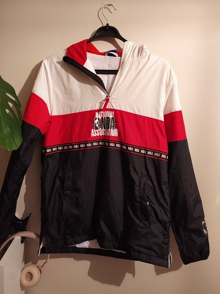 Yarım fermuarlı, uzun kollu, yüksek yakalı, kırmızı, beyaz ve siyah renk bloklu erkek yağmurluğu. Sentetik kumaştan, rahat kesim, dış mekan için uygun. ben kendim için almıştım