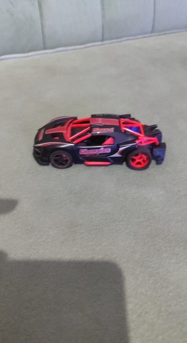 Koyu kırmızı ve siyah renklerde, sportif detaylara sahip 'Champion' yazılı oyuncak yarış arabası. Canlı kırmızı tekerlekleri vardır.