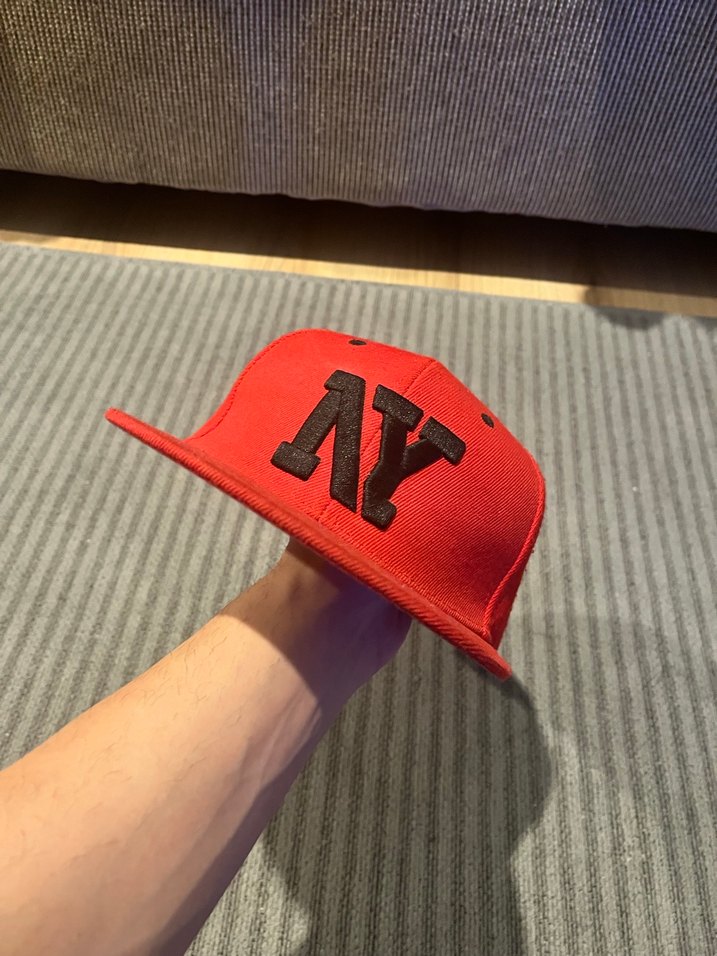 Düz vizörlü kırmızı erkek şapka, siyah 'AY' nakışlı, trend sokak stili athleisure görünümüne uygun.