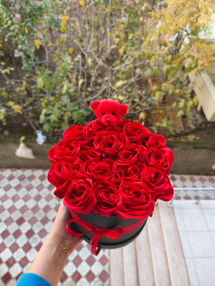 Canlı ve renkli kırmızı solmayan güllerden ve kırmızı ayıcıktan oluşan kutulu çiçek