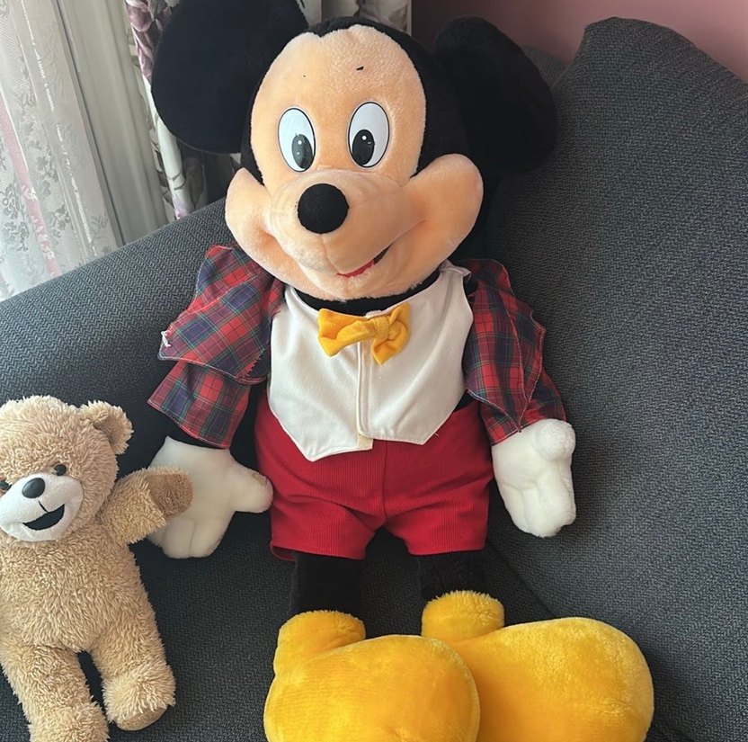 Mickey Mouse peluş oyuncak, beyaz yelek, kırmızı şort, sarı papyon ve kırmızı ekose ceket giymiştir. Renkli ve koyu tonlardadır.