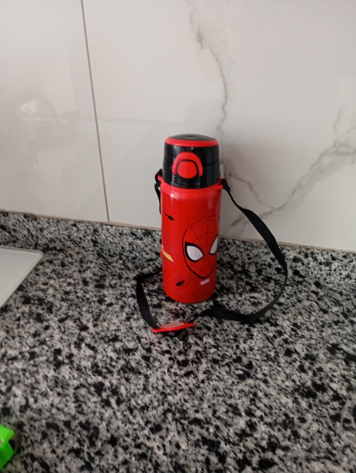 Canlı kırmızı renkte, Spiderman desenli ve taşıma kayışlı çocuk termosu.