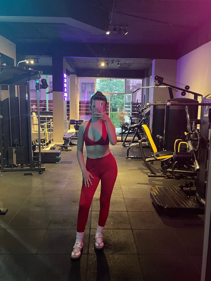 Koyu kırmızı, sentetik kumaştan yapılmış, transparan detaylı, kadınlar için dar kesim spor tayt ve üst