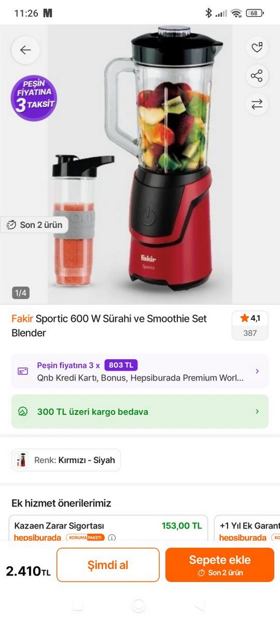 Kırmızı Sportic Fakir blender, sağlam taban ve meyve dolu şeffaf hazneye sahiptir. Smoothie için ekstra bardak ile gelir. az kullanılmış