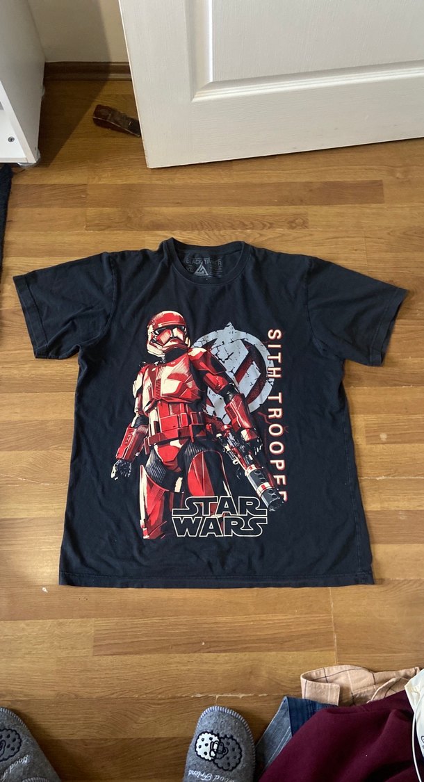 Kısa kollu ve bisiklet yaka, dar kesim erkek tişörtü. Koyu renk kumaş üzerinde Star Wars Sith Trooper baskılı, rock punk tarzında. Plastik malzemeden, tokalı detaylı.