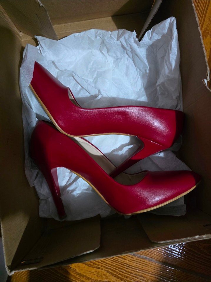 Kırmızı lastik malzemeden yapılmış stiletto topuklu ayakkabılar. Klasik ve çağdaş tarzda, desensiz ve renkli tasarım.