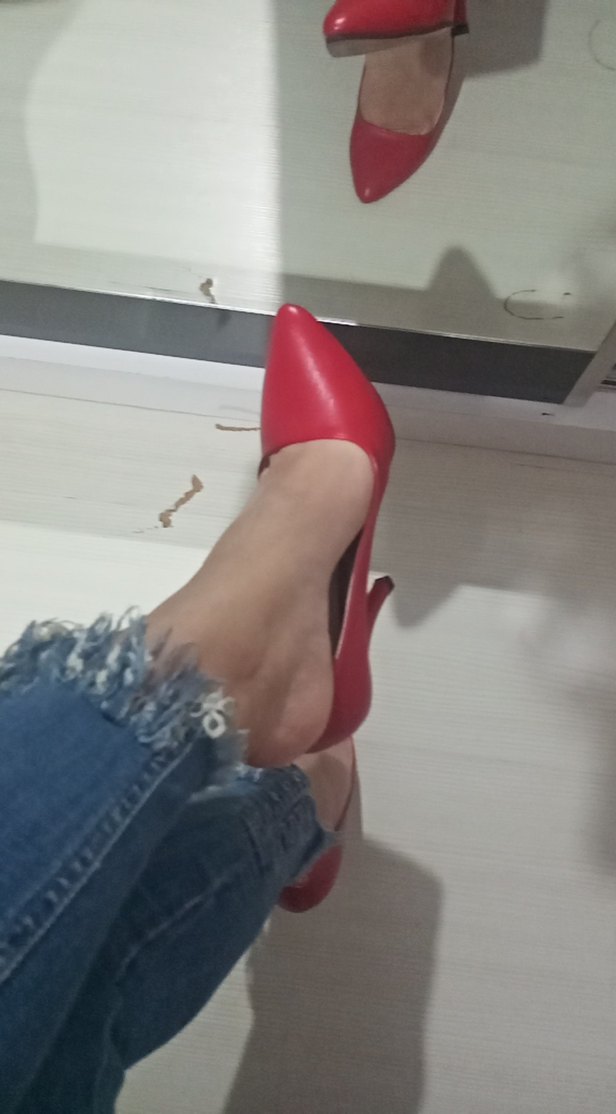 Denim malzemeden yapılmış kırmızı stiletto topuklu ayakkabı, bağcıklı detaylıdır. Minimalist ve normcore tarzda günlük kullanıma uygundur.
