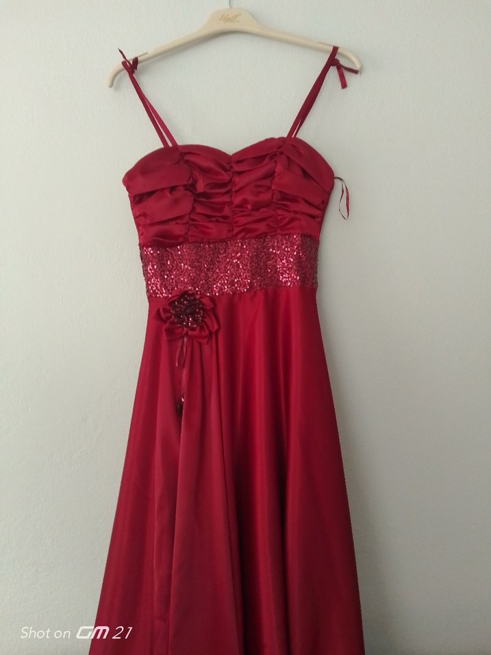 Kırmızı, straplez yaka ve ince askılı, drapeli üst kısmı olan, parlak ve desensiz midi boyda, klasik şıklıkta kadın abiye elbise. uzunluk askısız 124cm.gogus 40cm