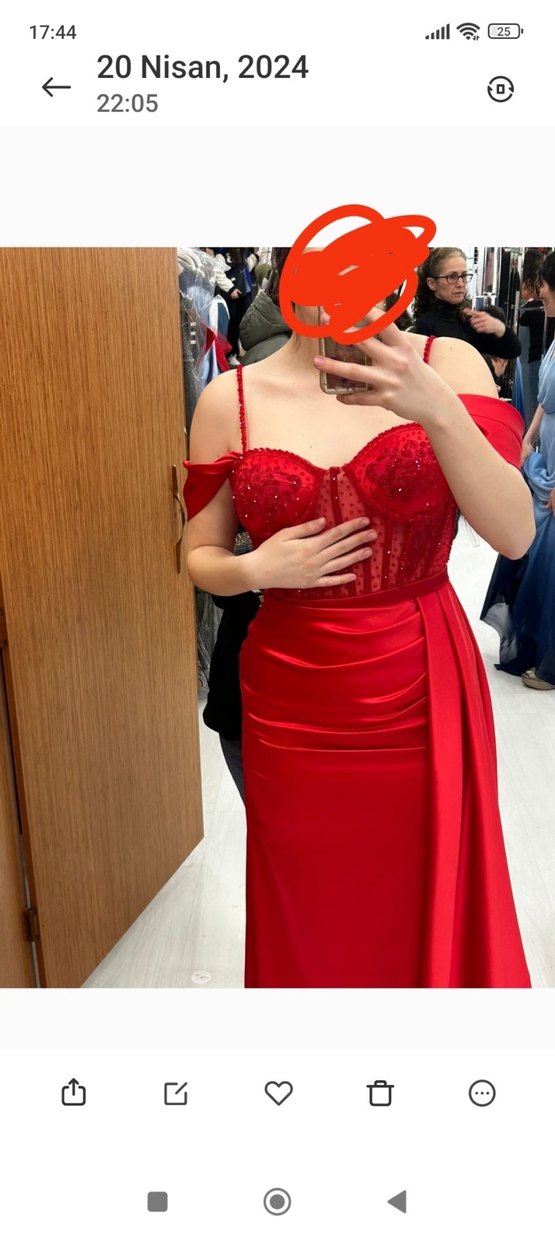 Vücuda oturan, straplez ve askılı kırmızı parlak midi abiye elbise, drapeli detaylara sahiptir. Modern klasik tarzda, düğün gibi özel anlara uygundur.