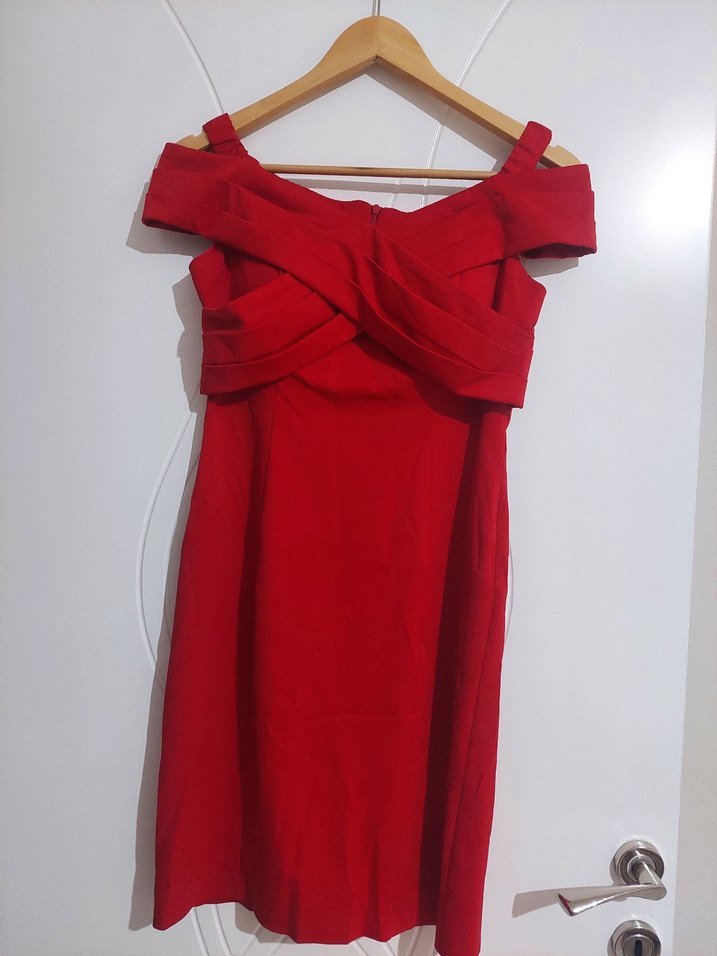 Parlak kırmızı kumaştan, straplez yaka ve drapeli detaylara sahip, klasik ve modern çizgide midi boy dar kesim elbise.