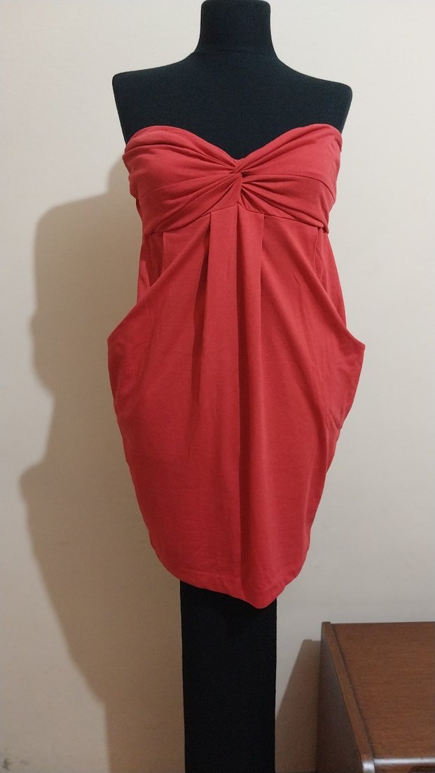 Kırmızı straplez, drapeli ve midi boy elbisesi. Sentetik kumaştan yapılmış, şık ve rahat bir tasarıma sahiptir.
