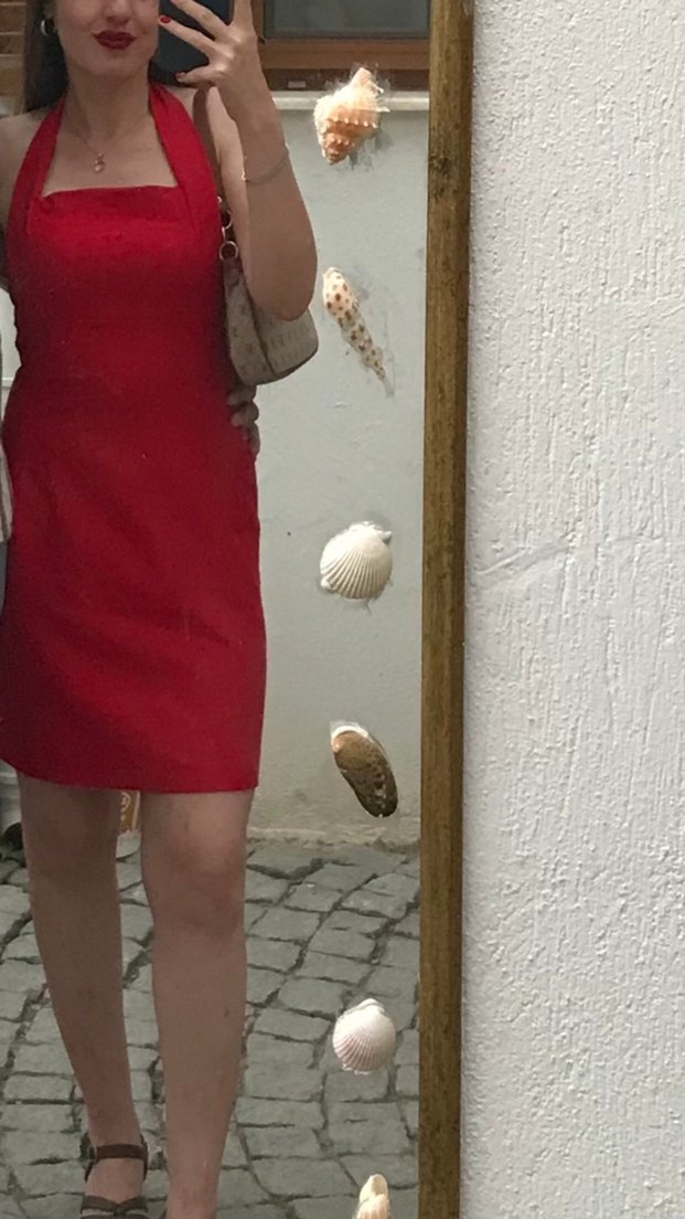 Parlak kırmızı renkli, straplez ve kolsuz, vücuda oturan elbise. Sentetik kumaştan, romantik akşamlar veya sokak stiline uygun, zahmetsiz şıklık sunar.