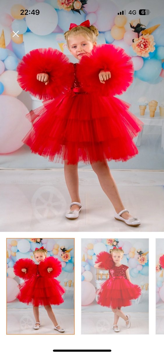 Hafif kırmızı, straplez yaka ve fırfır detaylı, yumuşak sentetik kumaştan yapılmış modern kesim elbise kollarında ponpon detaylı kızların severek giydiği bi elbise