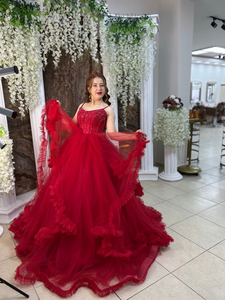 Kırmızı Straplez İşlemeli Uzun Abiye
