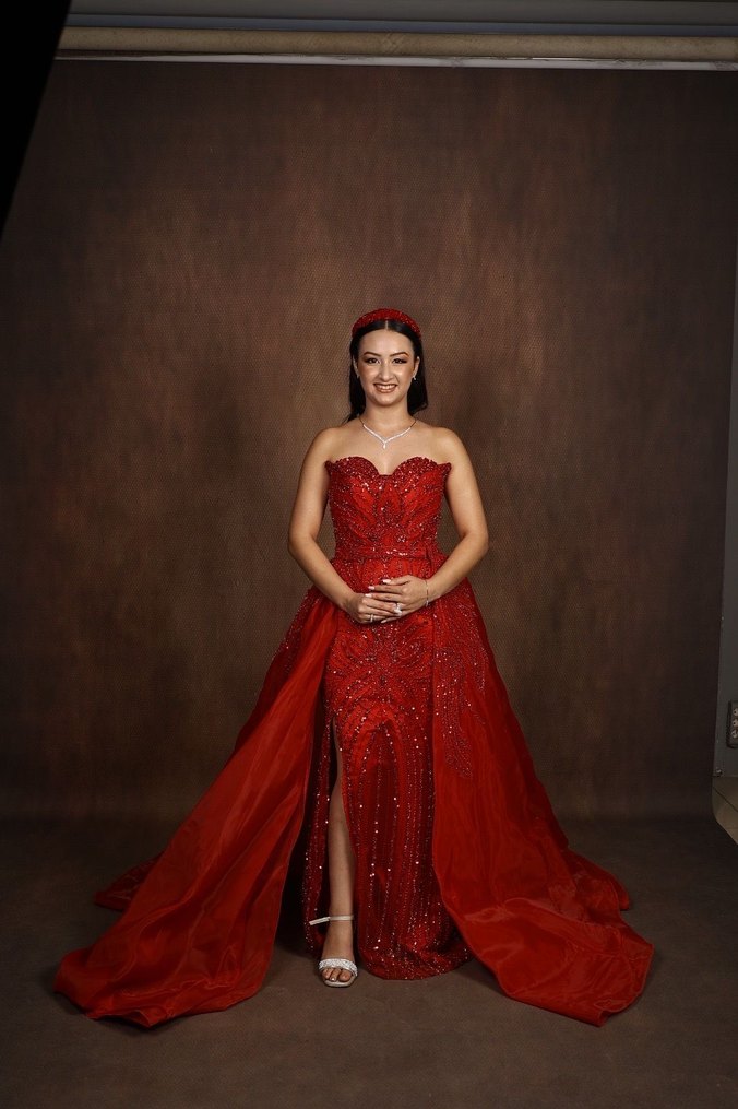 Cesur, straplez kırmızı abiye elbise, işlemeli detayları ve drapeli uzun etek kısmıyla göz alıcı bir tasarıma sahiptir.