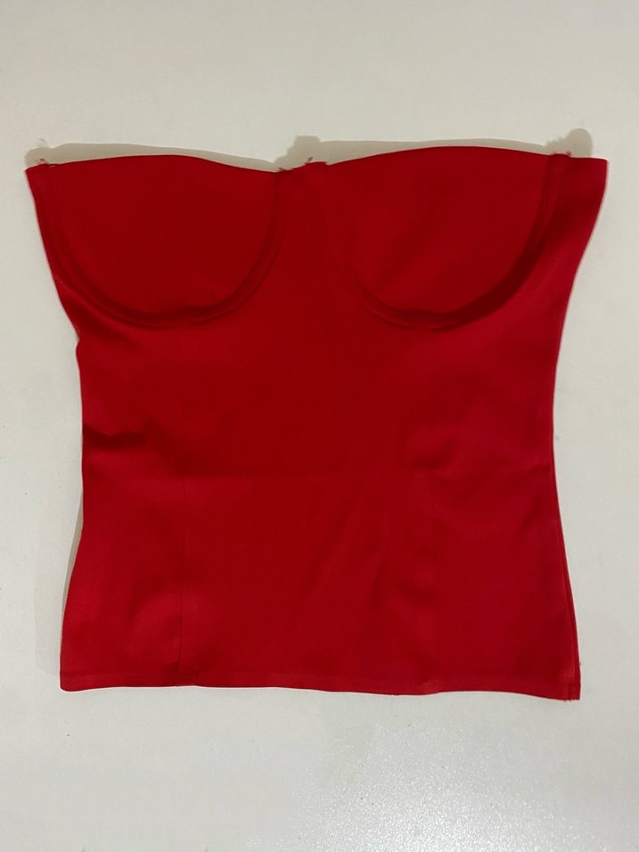Koyu kırmızı, straplez ve kolsuz kadın büstiyer. Sentetik, pürüzsüz kumaştan, minimal ve salaş tarzda. Günlük kullanım için şık ve rahat.