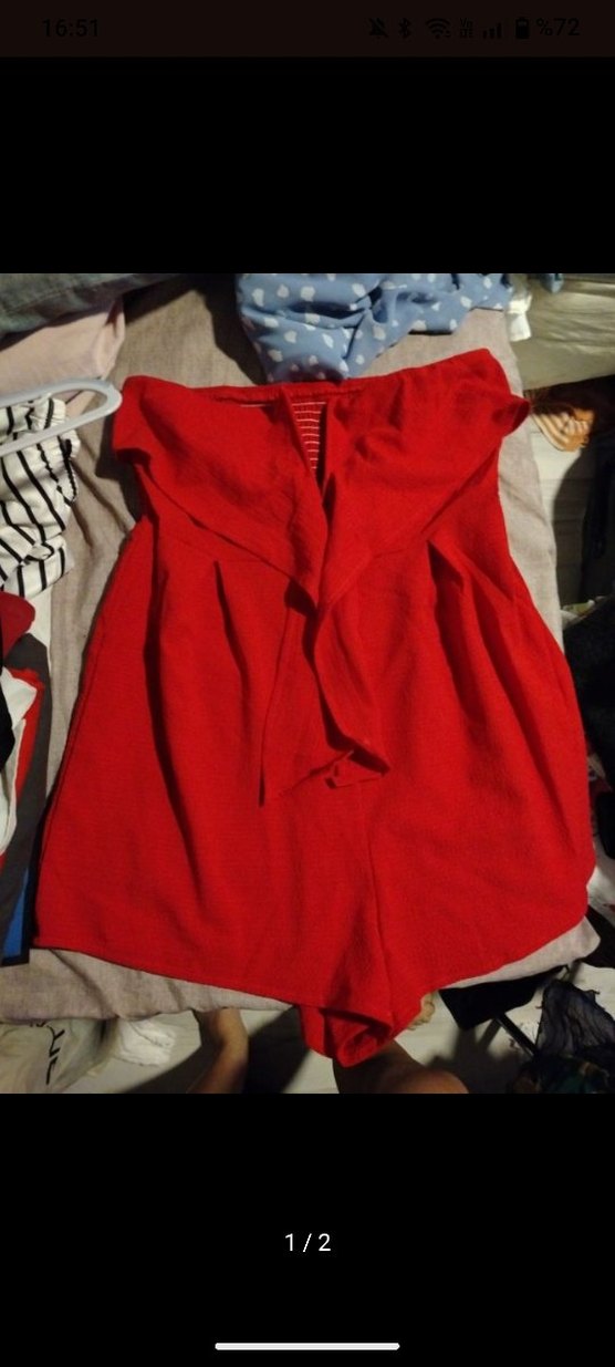 Kırmızı straplez keten mini tulum, bol kesim ve dökümlü detaylarla. Kolsuz ve rahat, sokak stili için uygun.