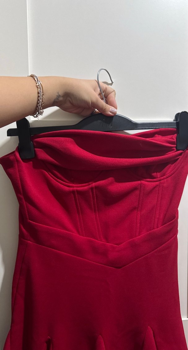 Kırmızı, straplez, vücuda oturan midi elbise. Parlak kumaş ve fermuarlı sırt detayıyla romantik akşamlara uygun.