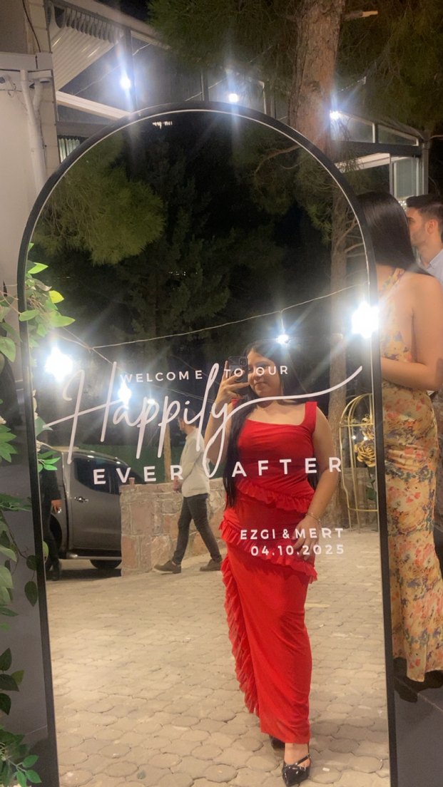 Kırmızı straplez midi elbise, bohem tarzda, baskılı parlak kumaş ve yırtmaç detayıyla avant-garde moda tutkunları için uygundur.