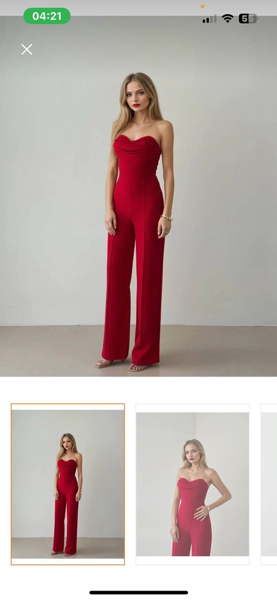 Kırmızı straplez midi tulum, drapeli detaylarla modern bir görünüm sunar. Normal boy ve rahat kesimlidir, ofis için uygundur.