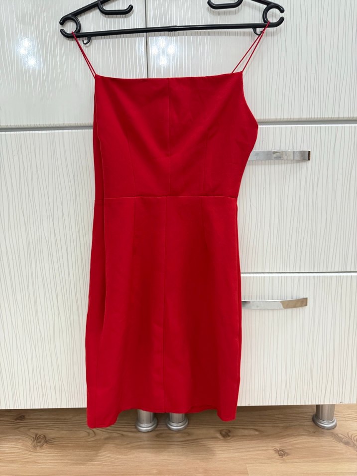 Kırmızı straplez mini abiye elbise, drapeli ve vücuda oturan kesime sahip. Parlak kumaşıyla romantik akşamlar için uygun, kolsuz ve minimalist tarzda. ❤️ m beden ama tadilat yaptırdım düğünde giymek için xs oldu 45 kiloya çok güzel vucuda oturuyo