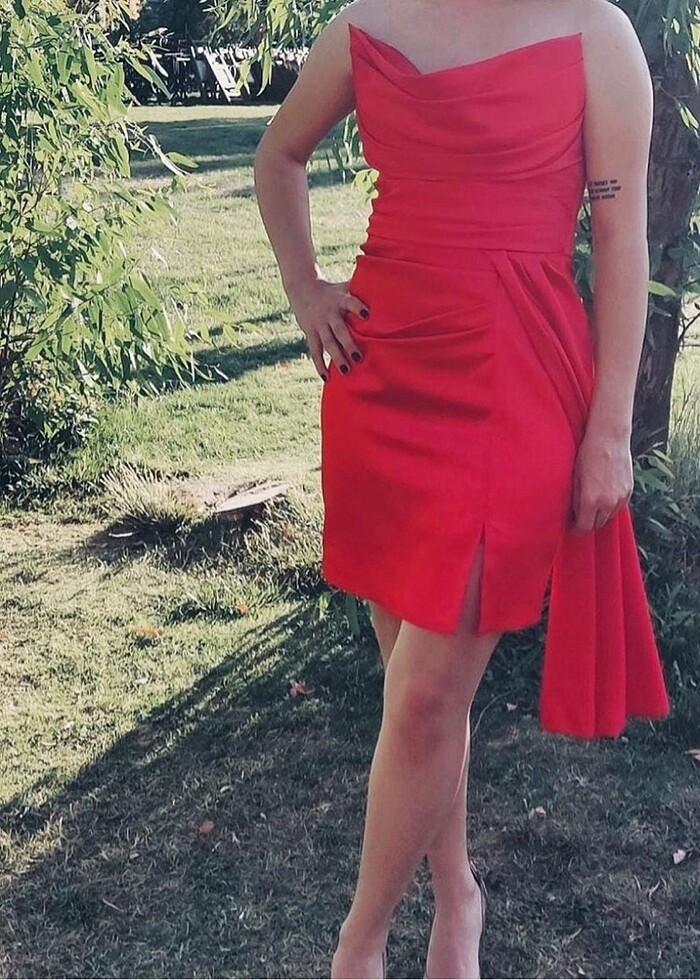 Kırmızı, straplez, mini boy abiye, 36 beden, dar kalıp. model 160 boyunda ve 55 kg. Bir kez giyildi, tertemiz