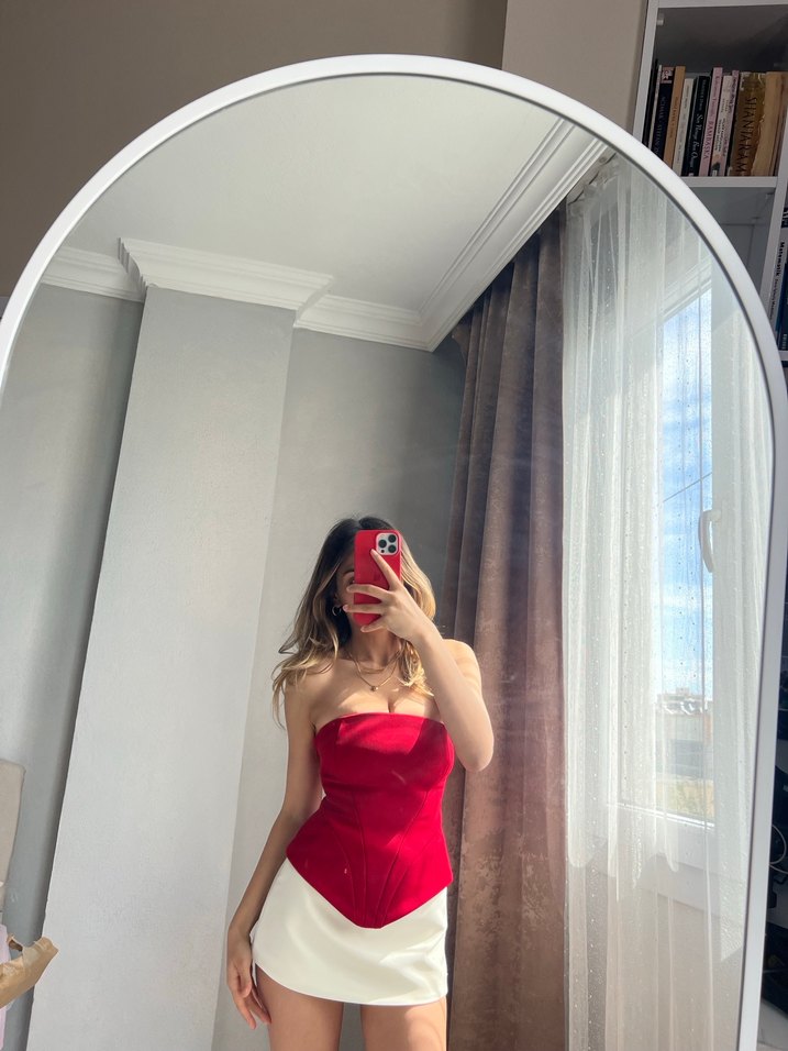 Ipeksi dokulu, straplez ve fit kesim kırmızı mini büstiyer, romantik akşamlar için zahmetsiz şıklık sunar. Göğüs kısmı 75-80 b olanlar tercih edebilir bana dar geldiği için hiç giyemedim çok beğendiğim bi ürün