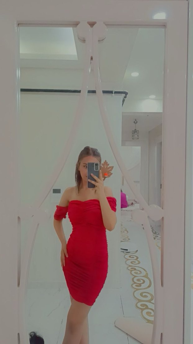 Bu kırmızı mini elbise, straplez yakası ve askılı kollarıyla dikkat çeker. Parlak, şeffaf kumaştan romantik akşamlar için uygundur. ✨