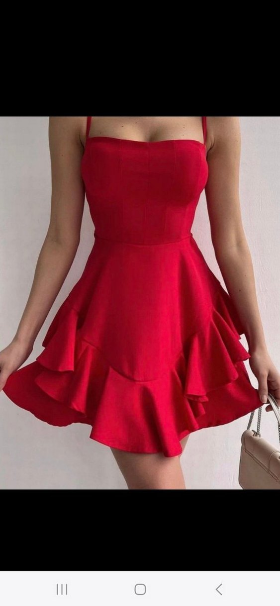 Parlak kırmızı sentetik kumaştan, straplez ve vücuda oturan mini elbise.kırmızı mini elbise 40 bedendir ilk fotoğraftaki ürünün aynısı kameramdan dolayı farklı çıkmış olabilir ürünün defosu vardır son fotoda belirttim fabrika hatası çizik gibi bir hatası var renginden dolayı çok belli etmiyor ama defoludur yinede göğüs pedi vardır kendiliğinden