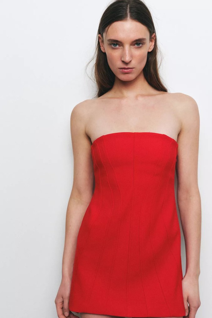 Parlak kırmızı renkte, straplez ve kolsuz, vücuda oturan mini elbise. Çağdaş tasarım ve pürüzsüz sentetik kumaşla romantik akşamlar için şık seçim.