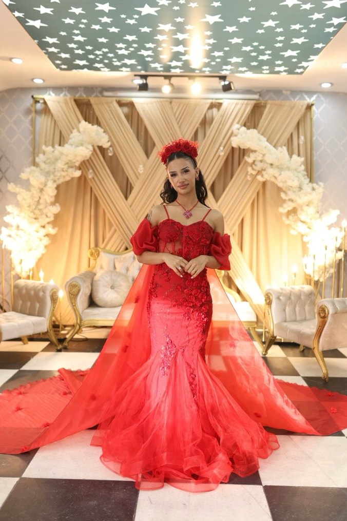Kırmızı, straplez yakalı ve askılı kollu, nakışlı desenlere sahip dar kesim uzun abiye. Drapeli tasarımıyla gösterişli ve bohem balık bir kınalık