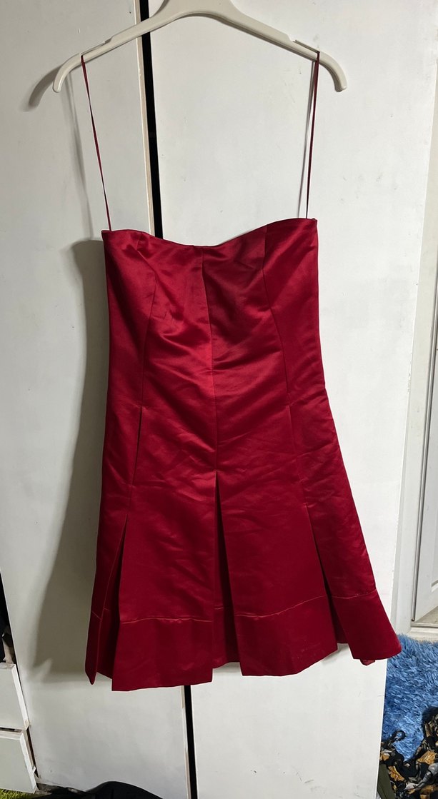 Kırmızı, straplez yakalı, pilili ve diz boyu uzunlukta şık abiye elbisedir. Parlak dokusu ve vücudu saran kesimiyle romantik akşamlar için uygundur. Kollu değildir.