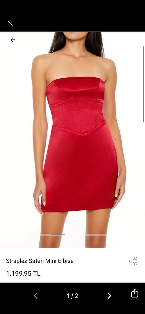Saten kumaştan yapılmış, straplez yaka ve ince askılı, kırmızı mini elbise. Drapeli detaylarıyla modern ve şık bir görünüm sunar. ✨