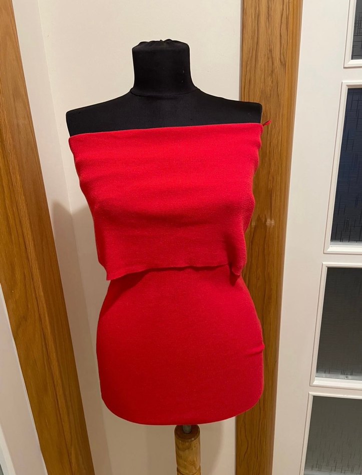 Kırmızı, straplez yaka ve drapeli tasarıma sahip, vücuda oturan kısa kollu bluz. Yumuşak ve sıcak kumaştan, çağdaş ve minimalist tarzda. Günlük kullanıma uygun. 1-2 kez kullanıldı kusuru yoktur.