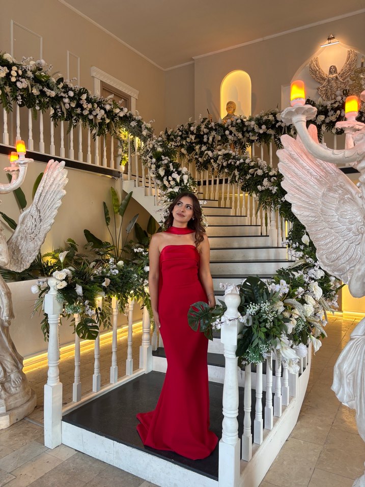 Kırmızı straplez, drapeli ve çiçek desenli uzun abiye elbise. Strappy kollu, parlak yüzeyli ve klasik modern tarzda, düğünler için uygun bir model. Kiralama da yapıyorum