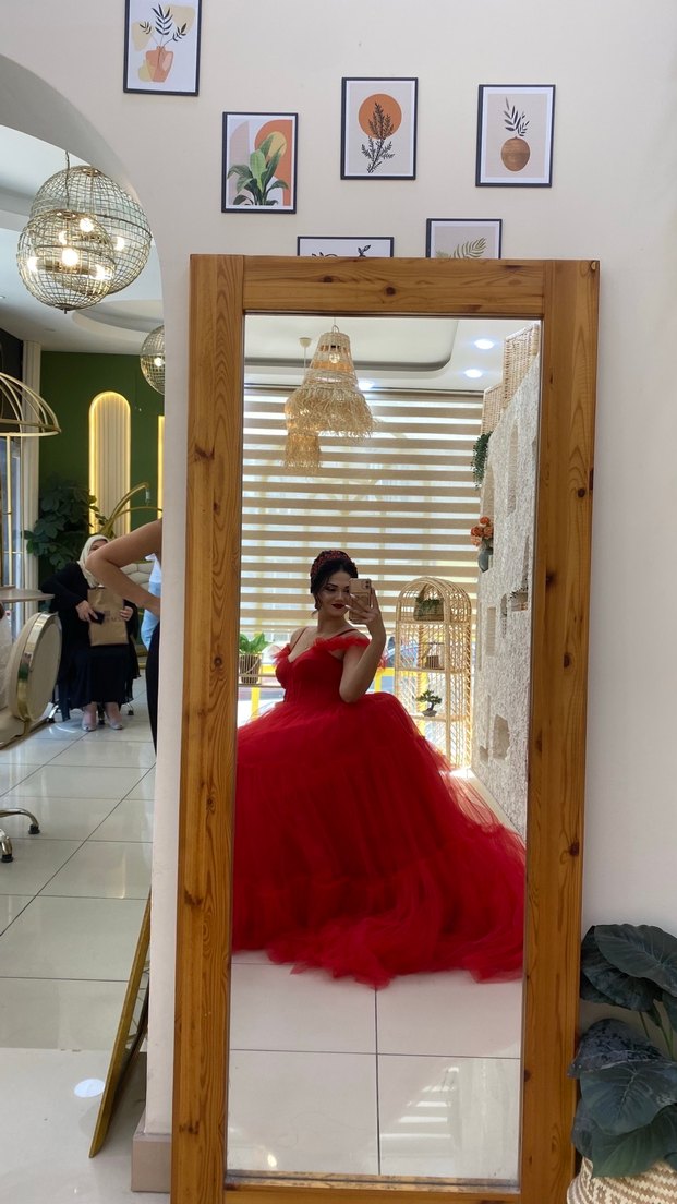 Kırmızı straplez, uzun ve vücuda oturan abiye elbise parlak kumaş ve fırfır detaylarına sahip. Modern ve gösterişli tasarımıyla trendsetterlar için ideal. Kolay ve desensiz.