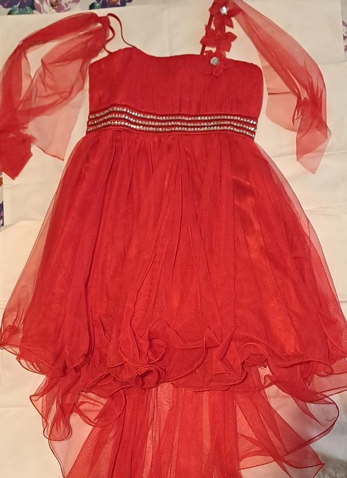 Uzun, straplez kırmızı abiye elbise, bol kesim ve drapeli parlak kumaşla avangart parti tarzına uygundur. Kolsuz ve desensizdir.