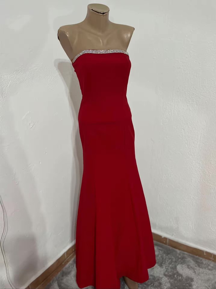Kırmızı straplez uzun abiye elbise, vücuda oturan kesimi ve drapeli ile dikkat çeker. Kolsuz ve parlak görünümlüdür, düğün ve özel davetler için uygundur. Kristalleri düştü göğüs kısmı Marka /hot contact