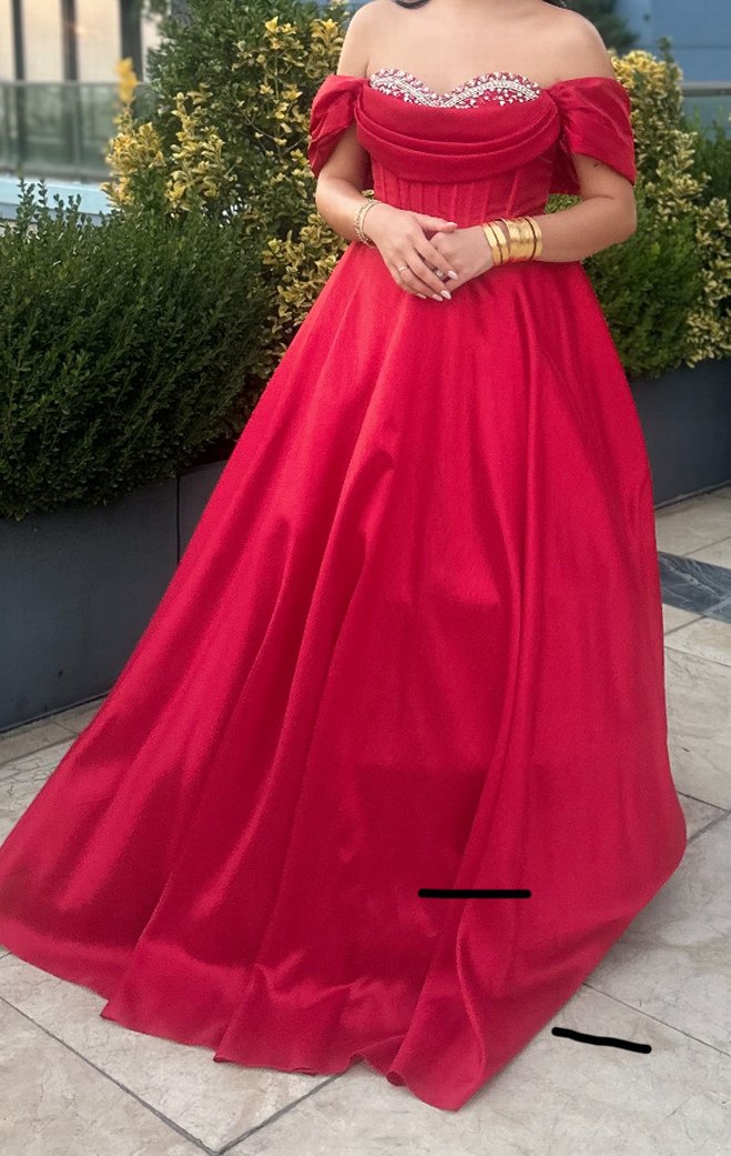 Kırmızı, straplez, drapeli uzun abiye elbise, parlak baskılı desene sahip, klasik ve şık bir düğün kıyafeti olarak öne çıkar. Kolsuz ve vücuda oturan model. Kınamda sadece yarım saat giydim, alan kişiye taç ve küpe ile birlikte yollanacaktır