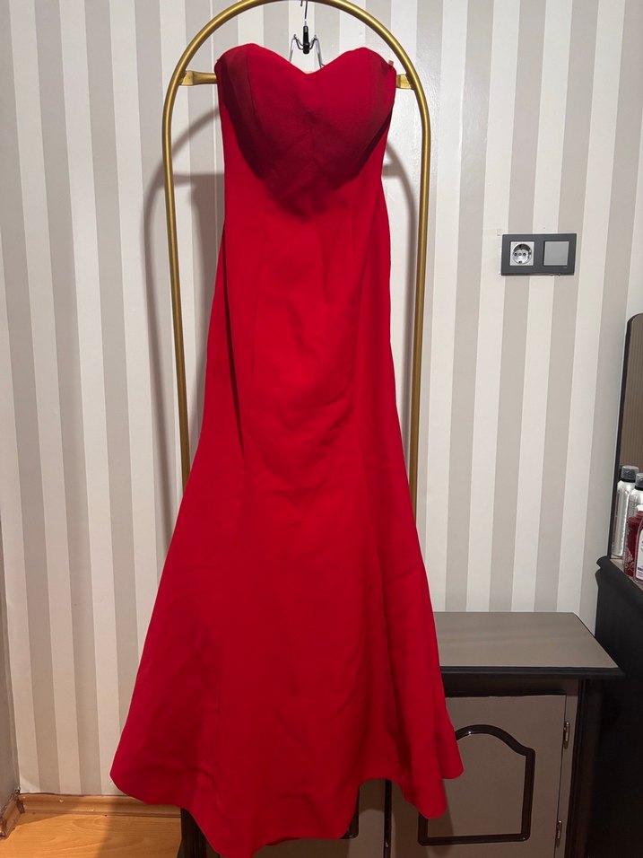 Klasik ve modern kesimli, kırmızı straplez uzun abiye elbise. Drapeli ve sımsıkı oturan, minimalist şıklık sunar. Düğün için uygundur. 36-38 beden uygundur