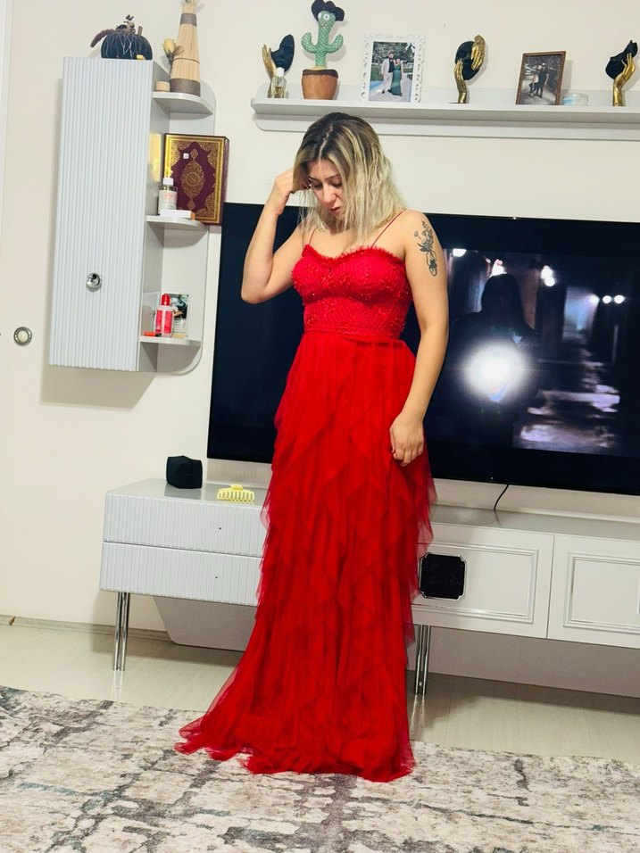 Koyu kırmızı renkte, straplez, vücuda oturan uzun abiye elbise, fırfır detaylı sadece 1 gece giyildi herhangi bir deformesi yoktur