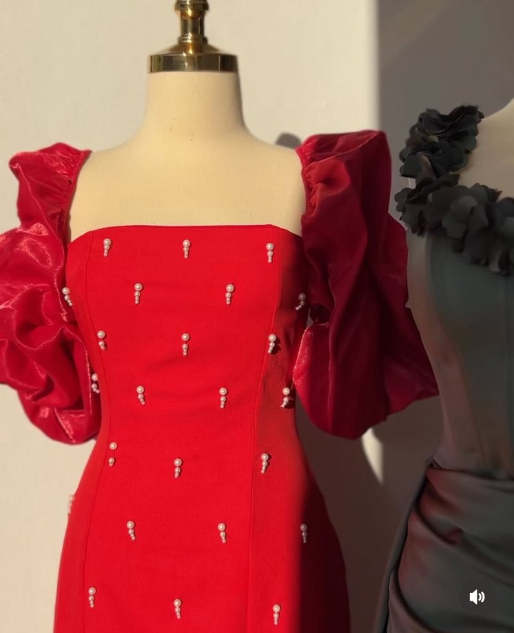 Kırmızı, straplez uzun abiye elbise, işlemeli detaylar ve fırfırlı kollarla dikkat çekici bir şıklık sunar. ✨
