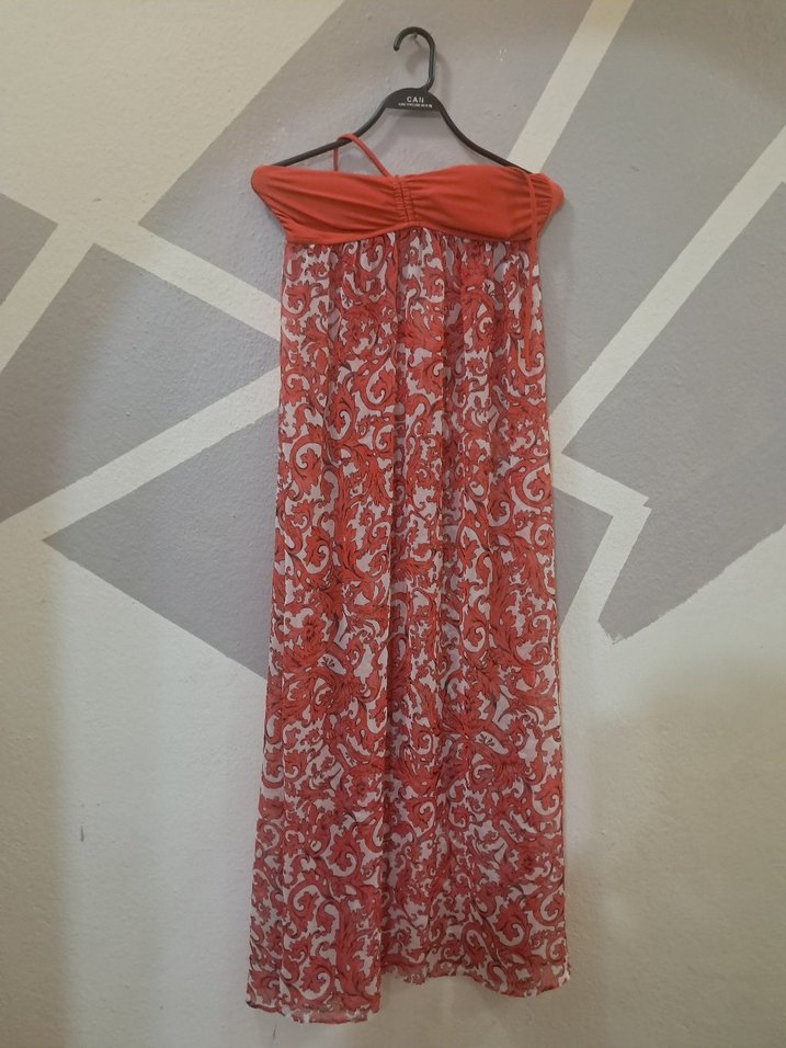 Kırmızı straplez uzun elbise, bol kesim ve batik desenli, yumuşak sentetik kumaştan yapılmıştır. Bohem tarz için uygundur.