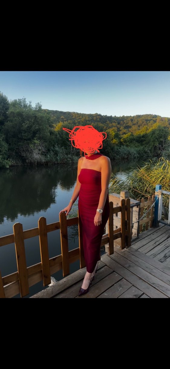 Koyu kırmızı renkte, straplez ve vücuda oturan uzun elbise, drapeli tasarımlı. Boyun fuları ve eldivenleri de mevcut Sadece 1 kere giyildi temizlenip gönderilecektir