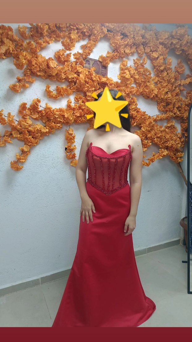 Kırmızı, straplez yaka ve drapeli detaylara sahip, vücuda oturan uzun abiye. Renkli ve desensiz tasarımıyla parti için uygun, modaya uygun bir model. 38-40 bedene uygundur