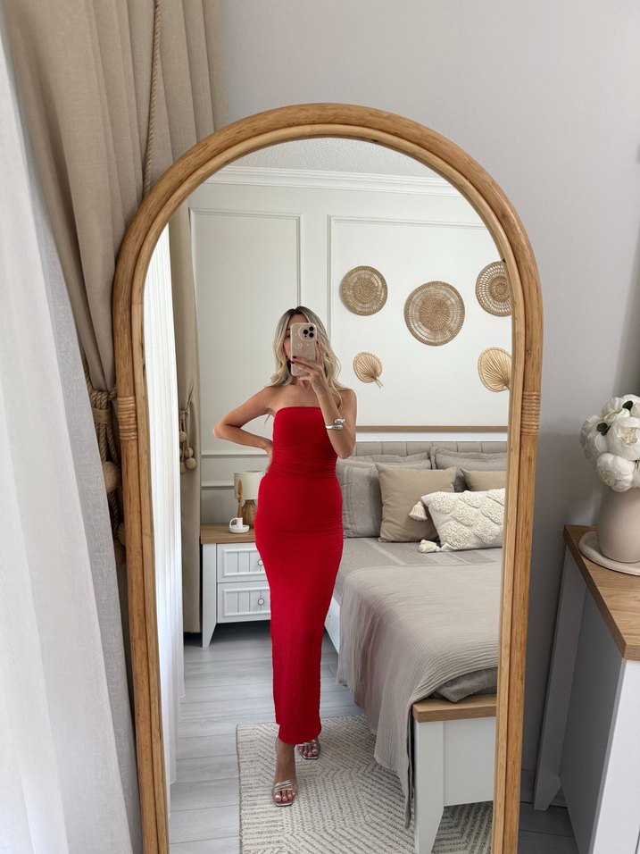 Parlak kırmızı saten kumaştan, straplez ve vücuda oturan uzun elbise, romantik akşamlar için zahmetsiz şıklık sunar. ✨