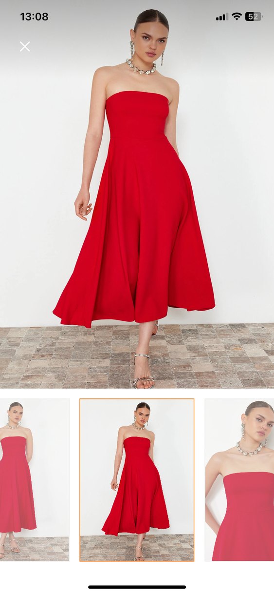 Kırmızı straplez uzun elbise, dökümlü ve bol kesimdir. İpek gibi kumaştan, modern klasik tarzda, düğün için uygundur. Kolsuz ve desensiz, minimal bir görünüm sunar.