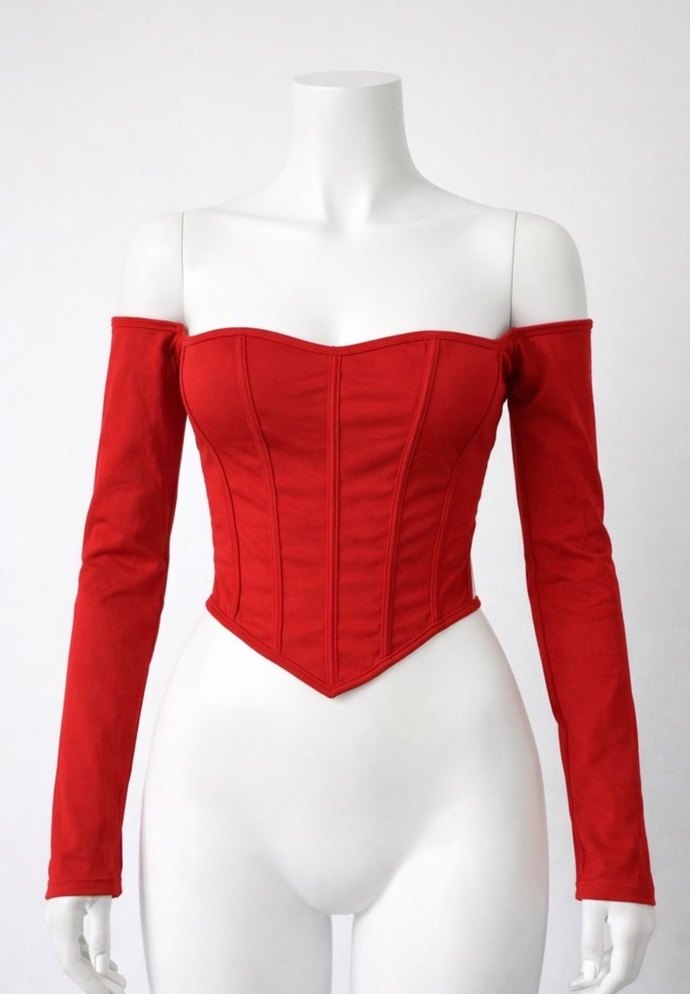 Kırmızı, straplez ve uzun kollu bu fitted büstiyer, sentetik kumaştan üretilmiştir. Günlük kullanıma uygun, çağdaş ve zahmetsiz şıklık sunar.
