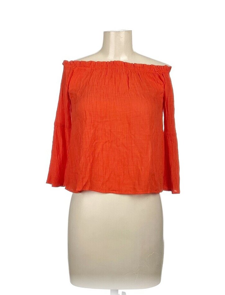 Kırmızı straplez yakalı, uzun kollu, bol kesim kadın bluz. Yumuşak keten kumaştan, pileli dokusu ve parlak görünümüyle günlük kullanıma uygundur.