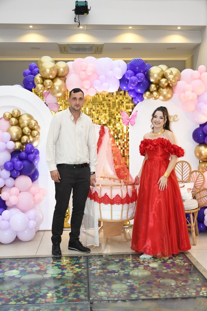 Açık kırmızı, straplez nişan elbisesi, bol kesim ve drapeli detaylarla etnik desenlere sahip. Kolsuz ve uzun boy, geleneksel ve avangart tarzı bir arada sunar. 6 ay kınasında giyildi yarım saat